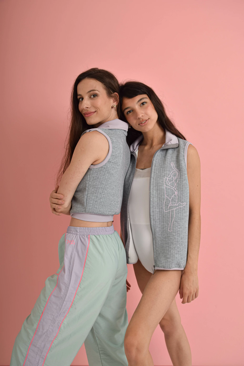 Gris con detalles en lila, con print dibujado a mano, y si lo más especial es que el dibujo es de una de nuestras modelos bailarinas posando ✨ asi que más exclusivo no viene!
