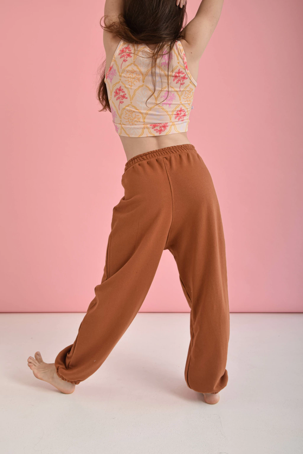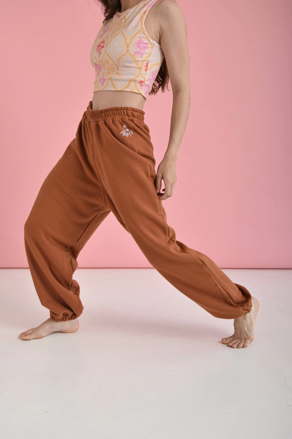 El pantalón es el clásico modelo jogger con tiro largo, ancho y tiene elástico en los puños.