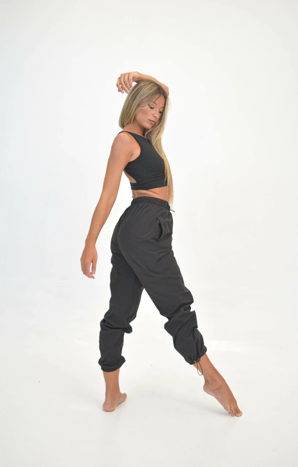 De tela tipo rompeviento, color negro, liviano, tiro alto, con bolsillos a los laterales, cintura y puños regulables. Tiene costuras reforzadas tanto en el interior como en el exterior