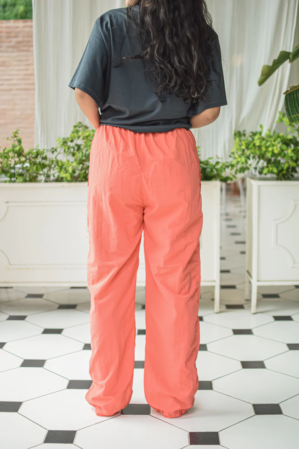 De tela tipo rompeviento, color coral, liviano, tiro alto, con bolsillos a los laterales, cintura y puños regulables.