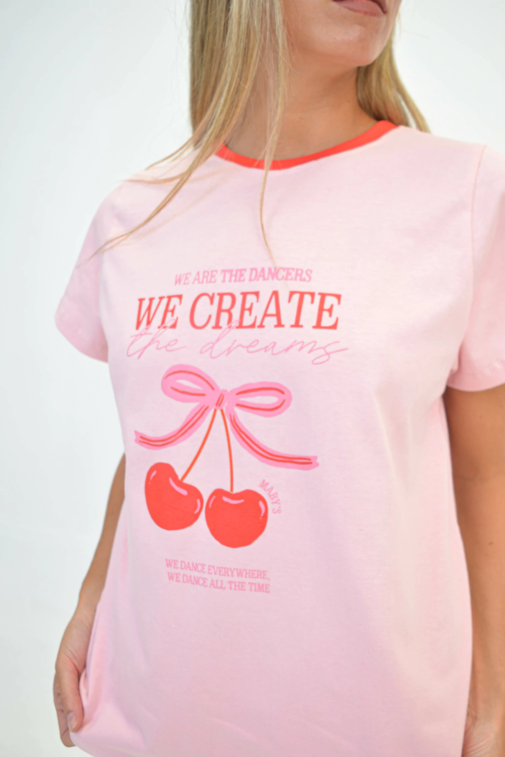 Composición remera: jersey de algodón color rosa, combinada con cuello color rojo, proceso de estampado, serigrafía.