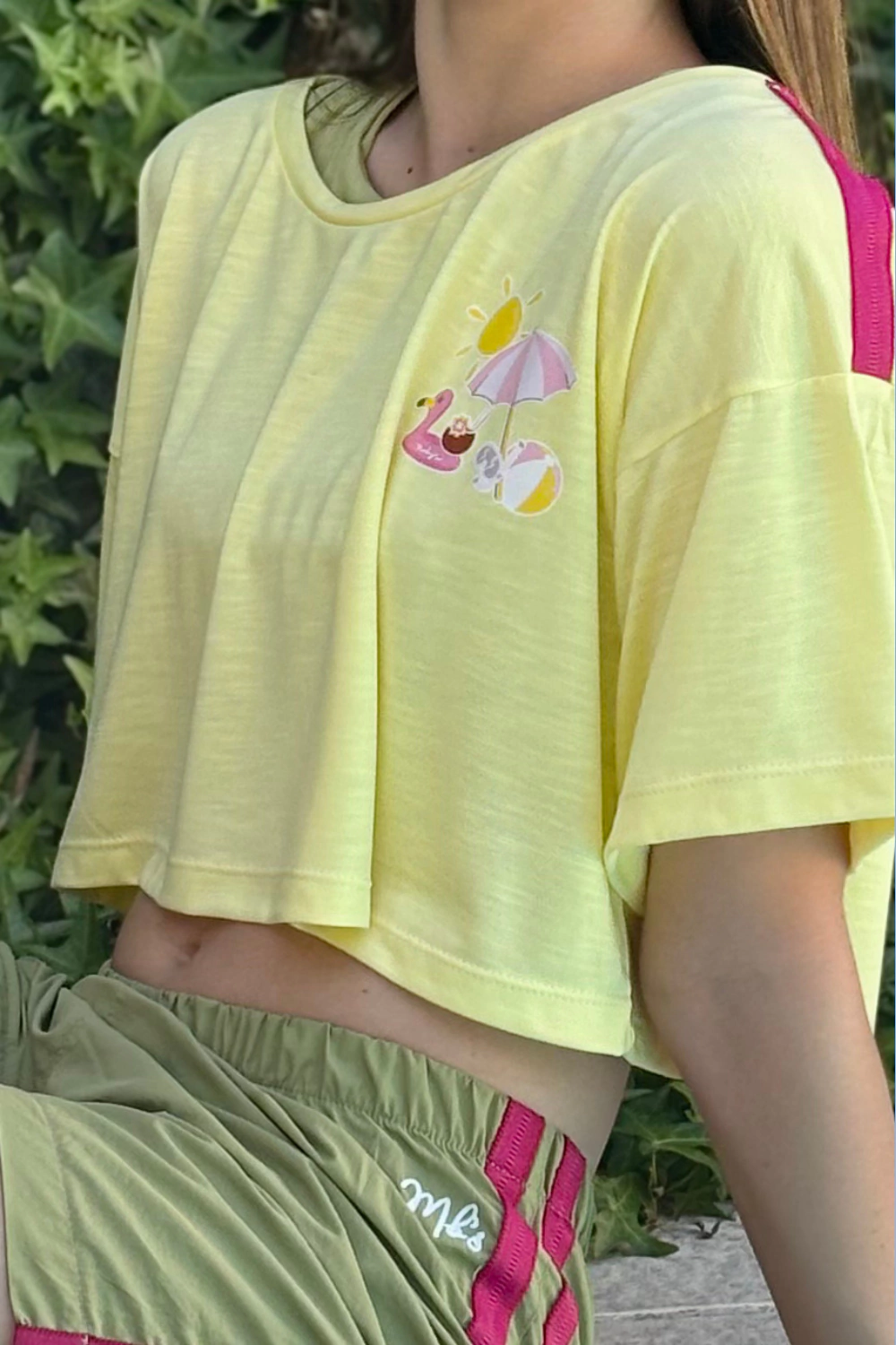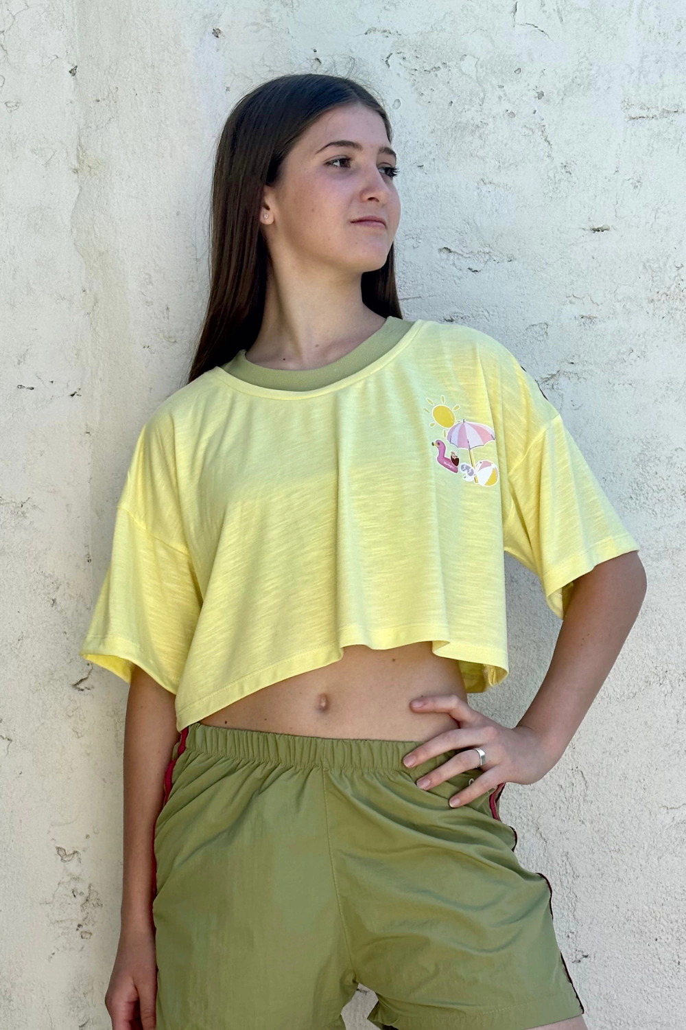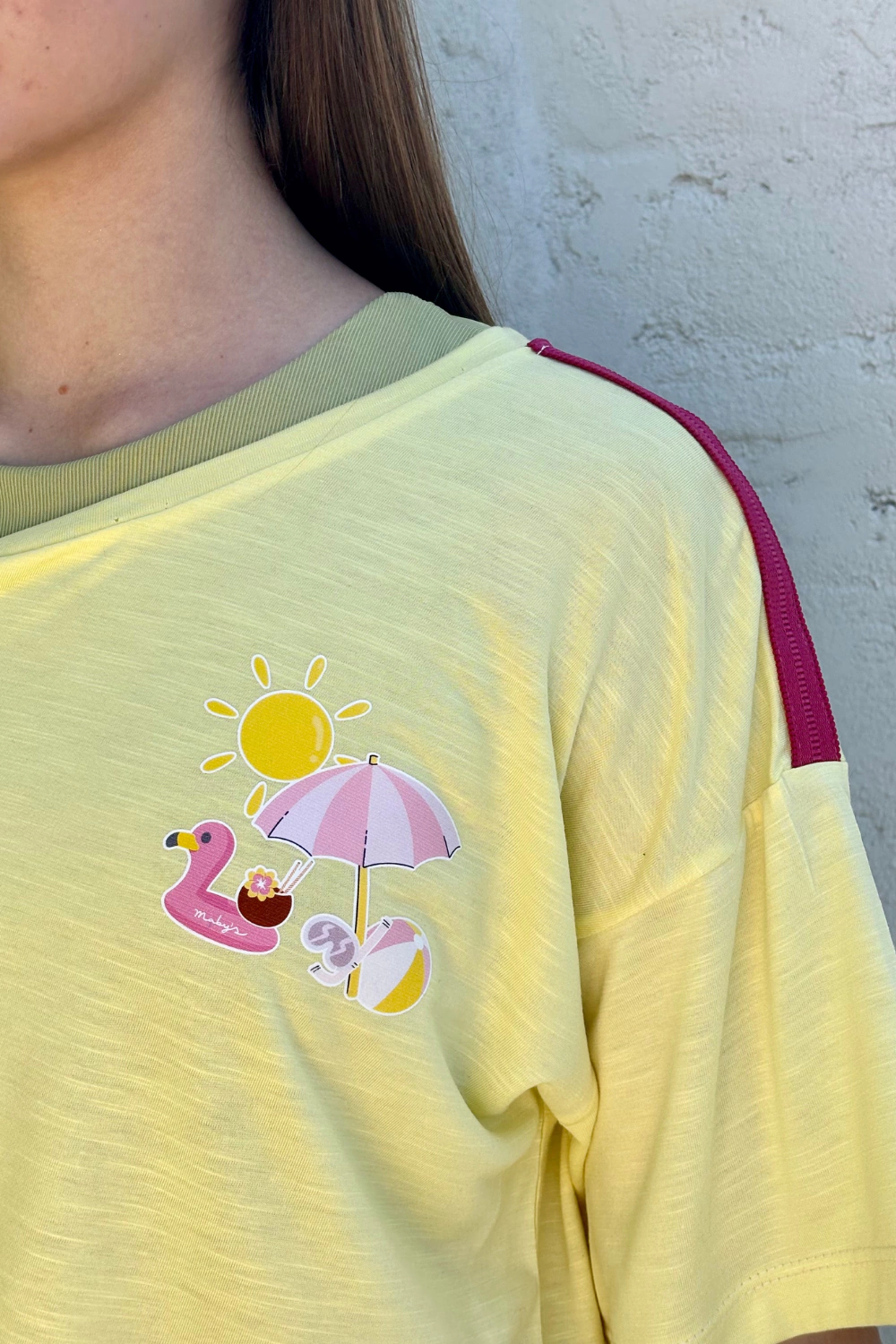 La remera que necesitas este verano para bailar cómoda sin sufrir el calor. Corta, anchita y fresca, en color amarilla, con detalles rosas en los hombros, que combinan con el short. La estampa de la colección, diseño único hecho por nosotras.